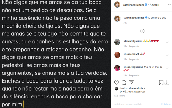 "Não digas que me amas se da tua boca não sai um pedido de desculpas. Se a minha ausência não te pesa como uma mochila cheia de tijolos. Não digas que me amas se o teu ego não permite que te curves, que apanhes os estilhaços do erro e te proponhas a refazer o desenho", começa por escrever Carolina.